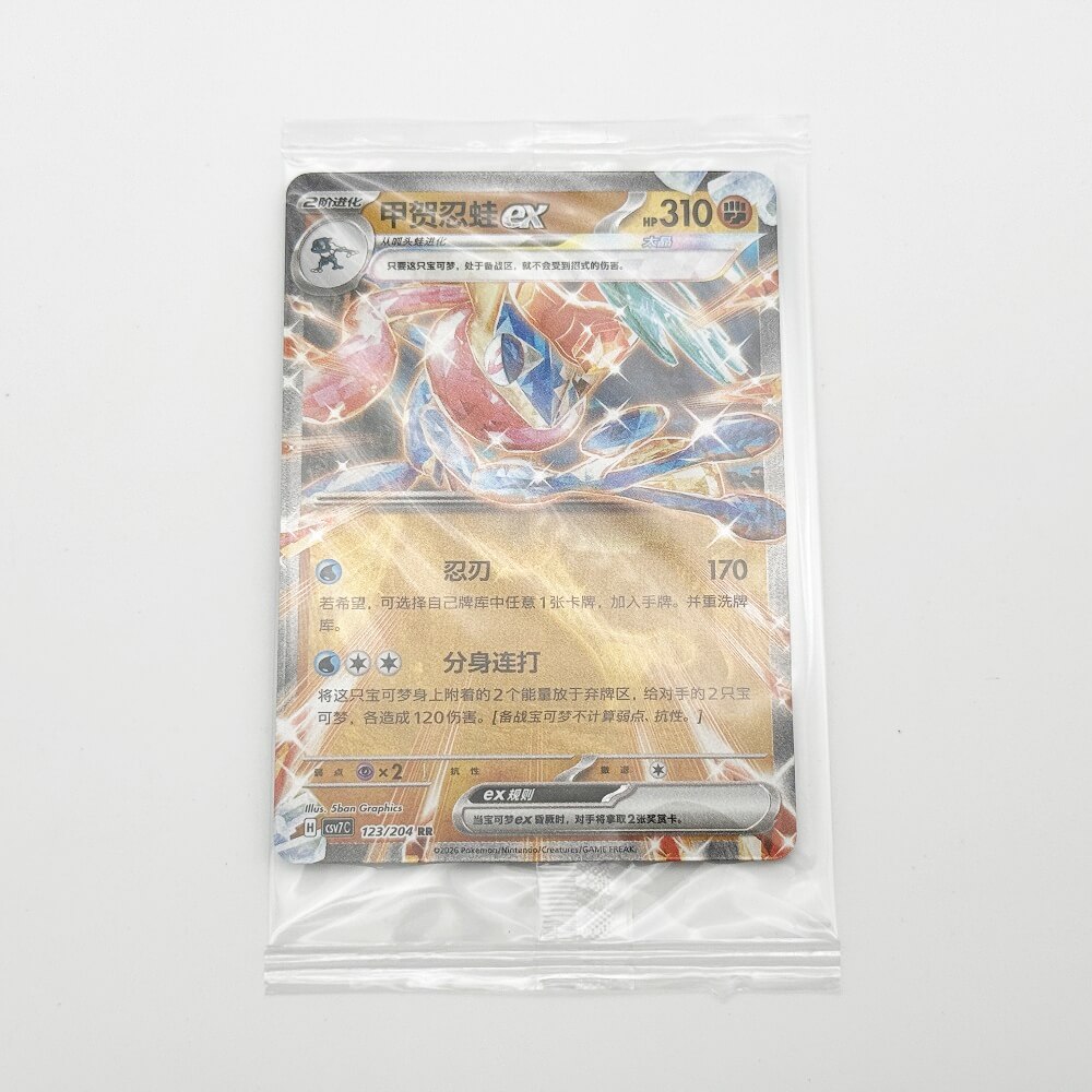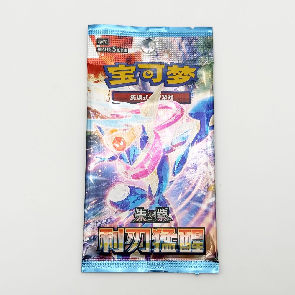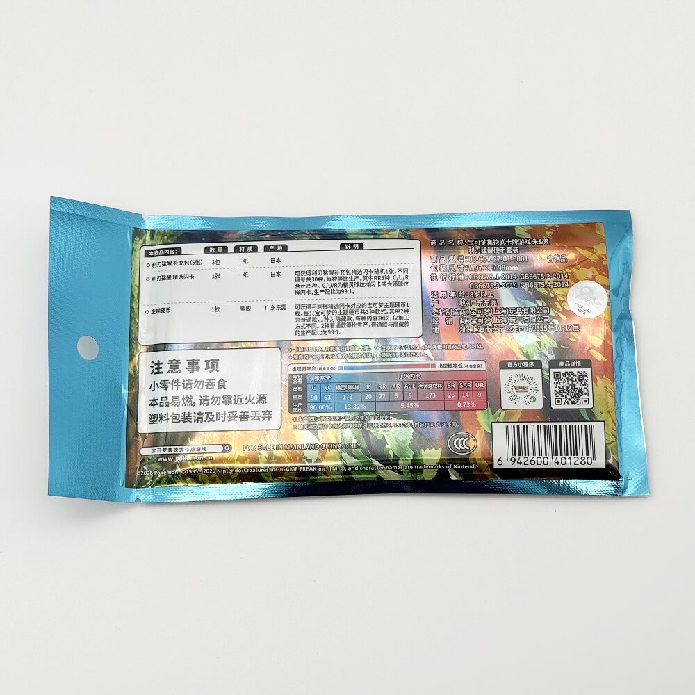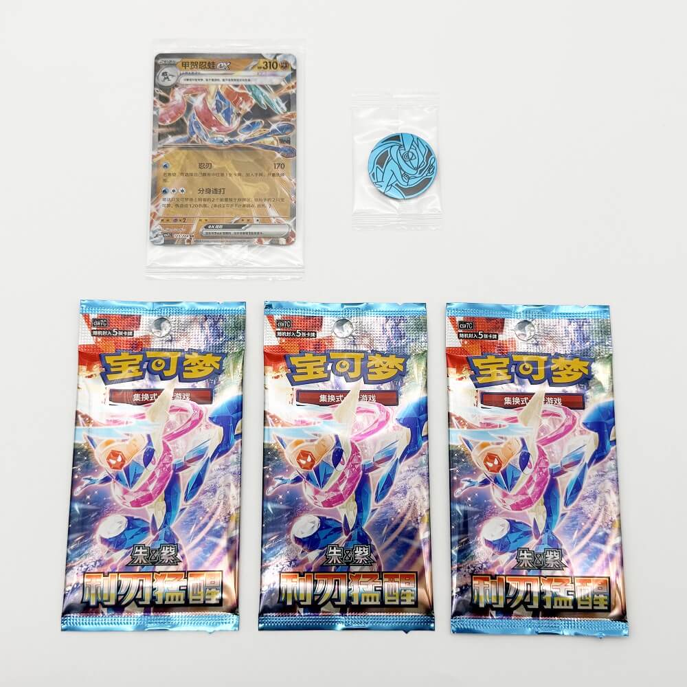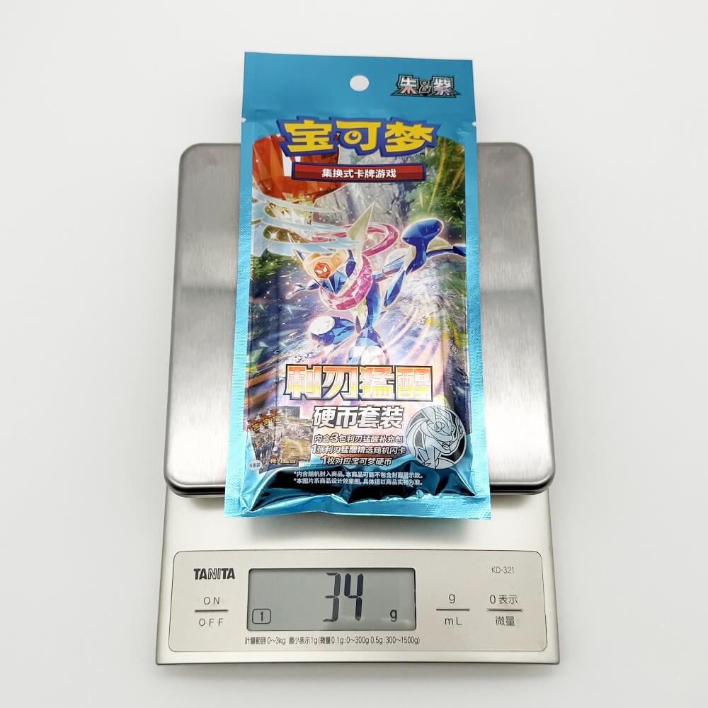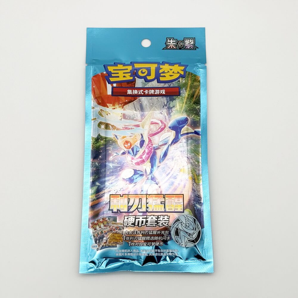 内容物としては、中国版のポケモンカード1枚、ポケモンコイン1枚、「利刃猛醒」のパックが3つ封入されています。