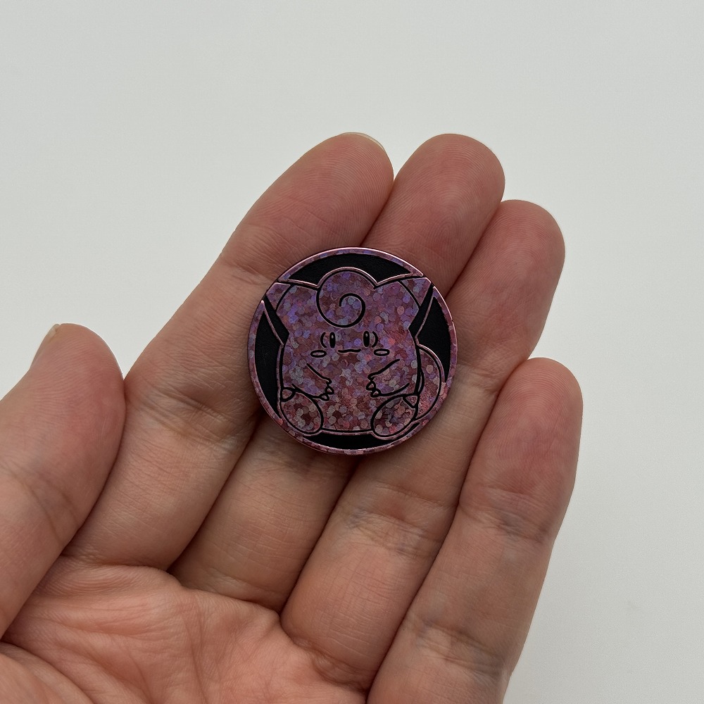 ピッピを絵柄にしたピンクスペクルホロ、裏黒コインです。 2025年12月19日より全国のポケモンセンターのカプセルトイ自動販売機、ポケモンセンターウェブサイトにて発売されたカプセルトイ10種のうちの1種です。