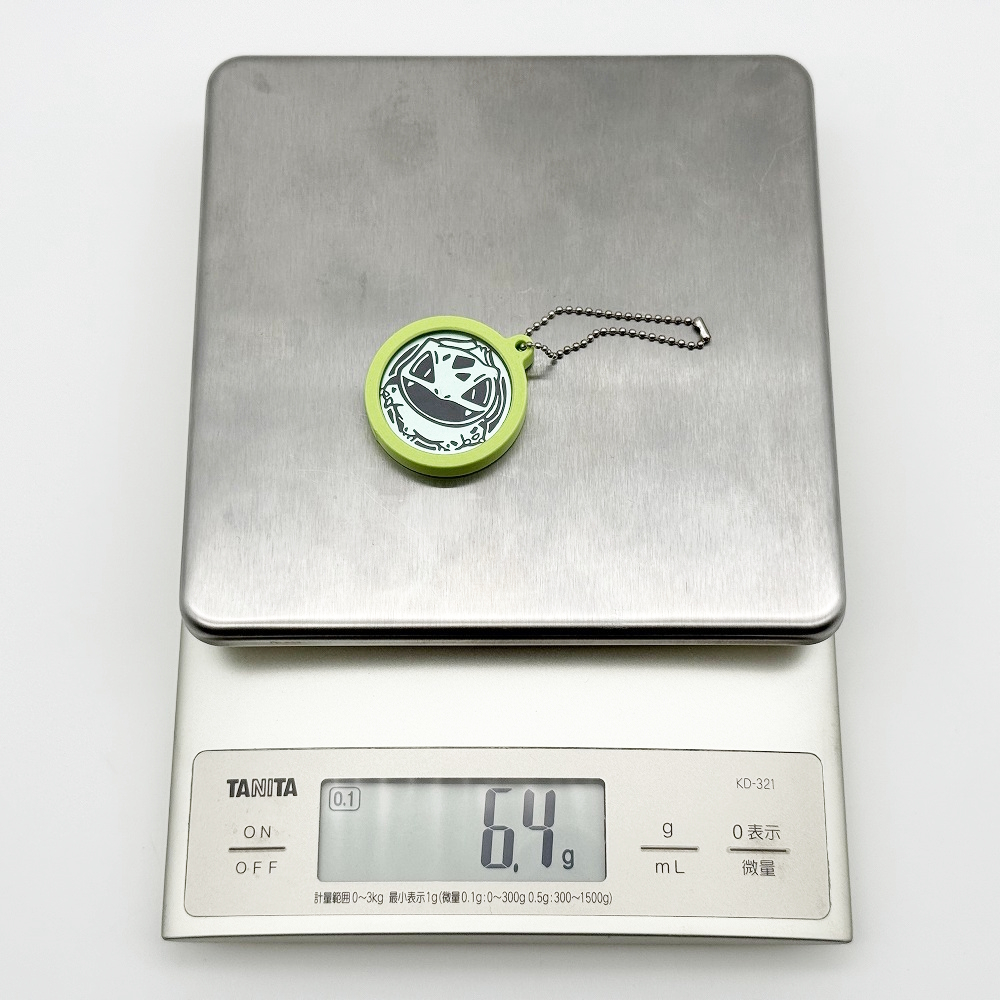 The keychain weighs about 4.6 g on its own, and approximately 6.4 g when a Pokémon coin is inserted.