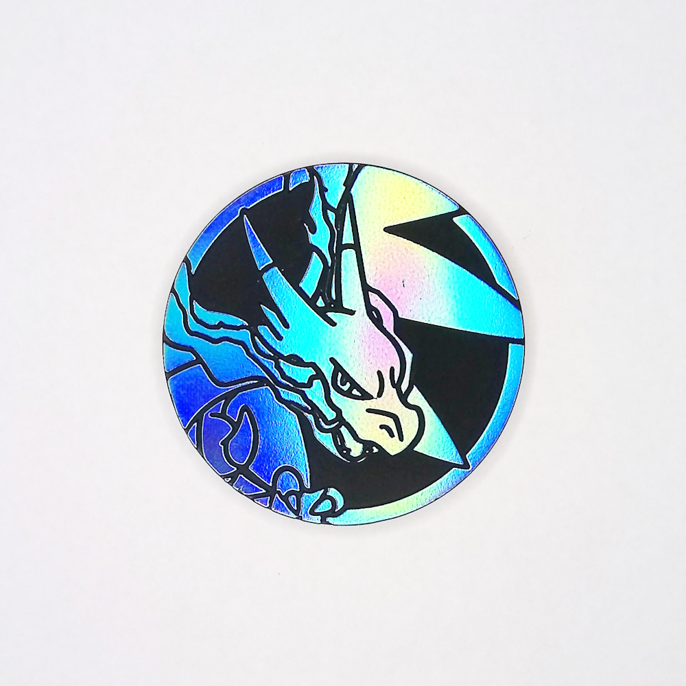 メガリザードンXを絵柄にしたブルーレインボーホロ、黒裏コイン。