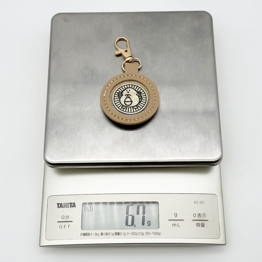 The keychain weighs about 5.0 g on its own, and approximately 6.7 g when a Pokémon coin is inserted.